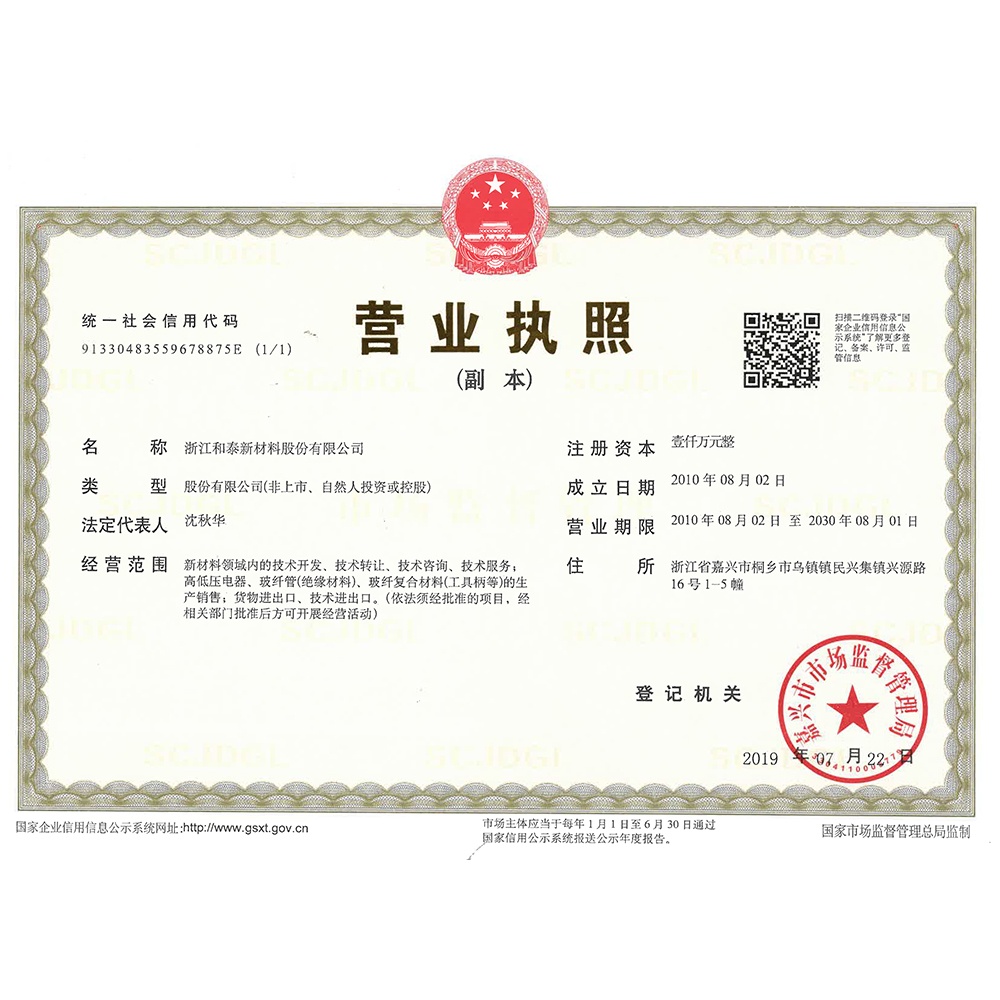 浙江和泰新材料股份有限公司(原浙江和泰電器有限公司)成立于2010年8月2日。公司座落于水鄉古鎮、世界互聯網大會永久舉辦地—烏鎮!是一家集研發、生產、銷售于一體的高新技術企業及浙江省專精特新中小企業。公司專注于生產環氧玻纖纏繞復合管。行業領域,高分子材料、功能性材料,致力于為客戶提供創新的材料解決方案。主要產品:高、低壓電器及輸變電絕緣管,銅箔 FRP 收卷管,化工、石油勘探用耐高溫套管,氣缸油缸套管,鋰電池套管,人工隆雨彈套管,電吸附水處理膜殼,軍工配套用品等系列產品。
